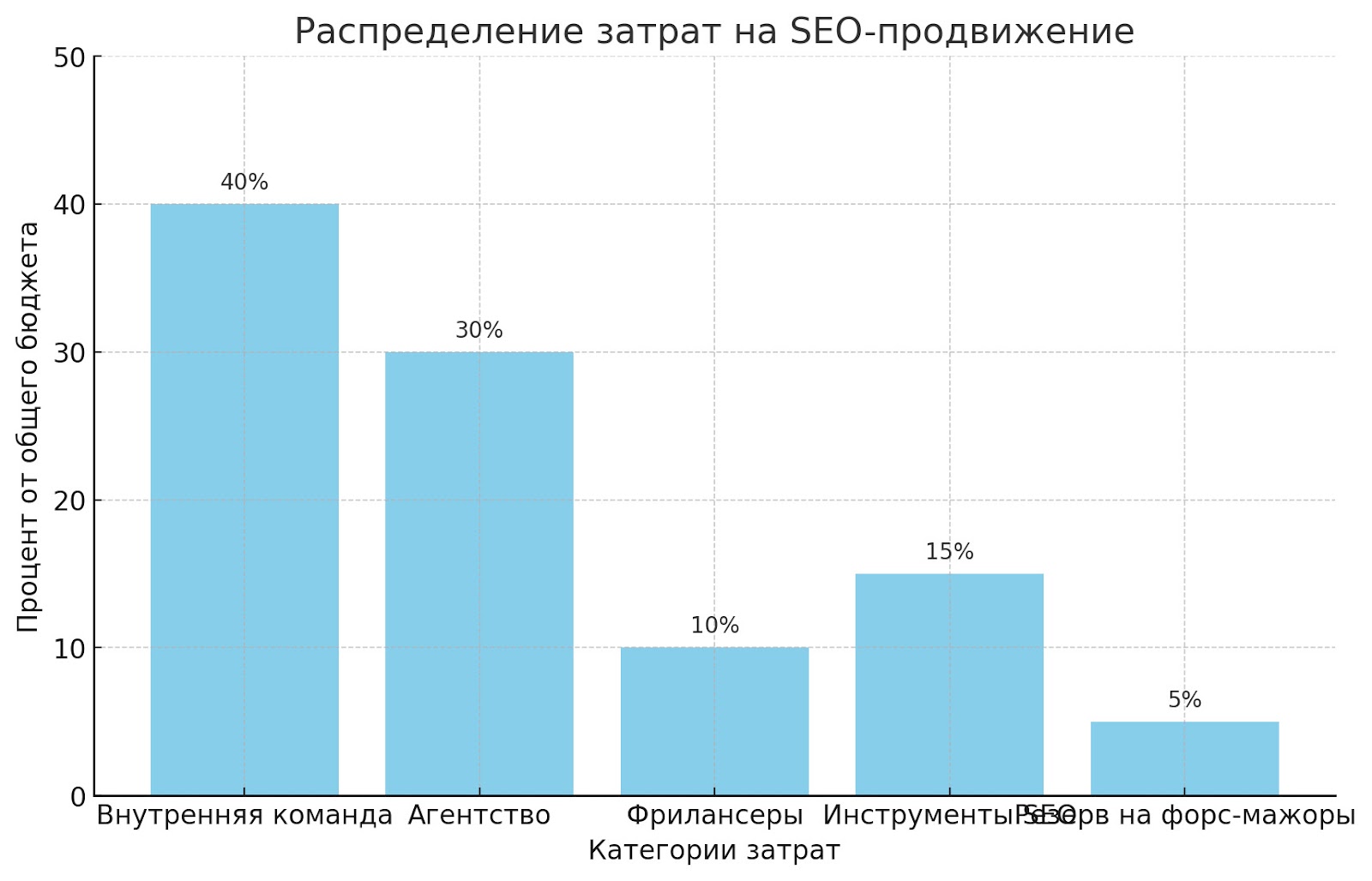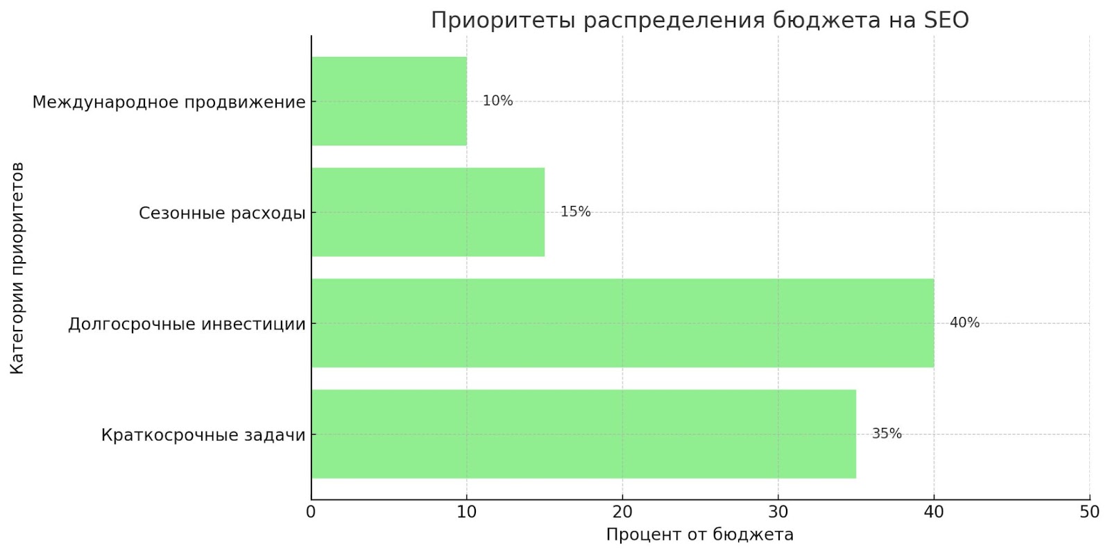 • Доход. Рекомендуется выделять на SEO-продвижение от 5% до 10% общего дохода компании. Важно учитывать расходы на другие каналы продвижения для создания гармоничной маркетинговой стратегии.